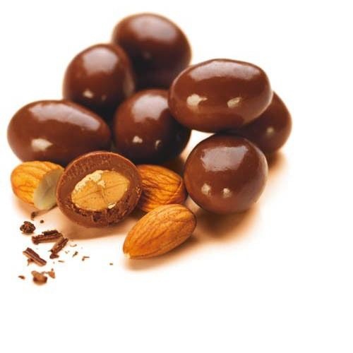 Almendras enteras seleccionadas, tostadas y recubiertas con chocolate leche de primera calidad.
