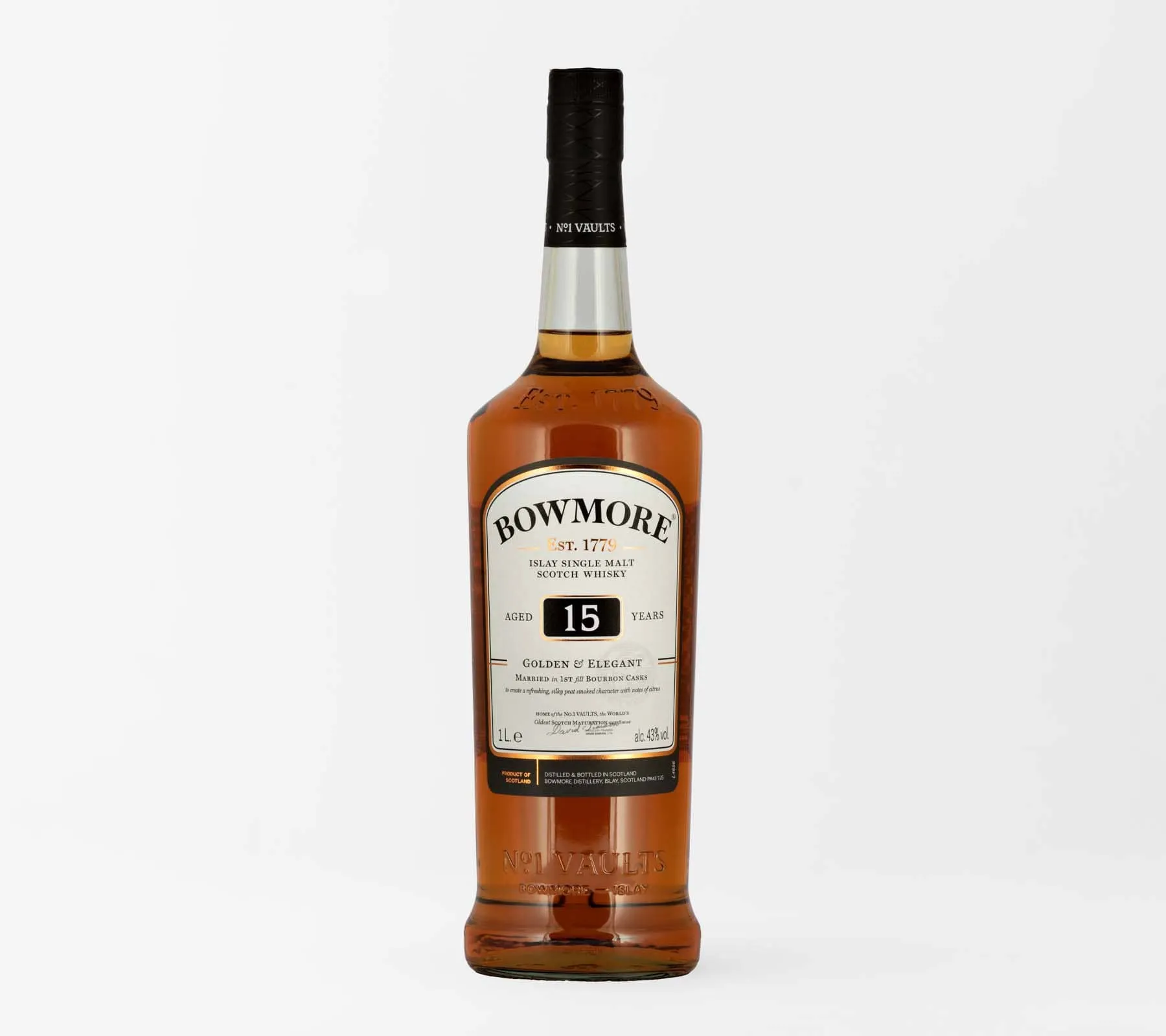 Con una tradición que se remonta a 1779, Bowmore es conocida por su habilidad única para equilibrar las clásicas notas salinas, ahumadas y iodadas de la región con la influencia de diversas barricas de añejamiento. Este whisky de 15 años de edad es un testimonio vivo de su maestría en la destilación.