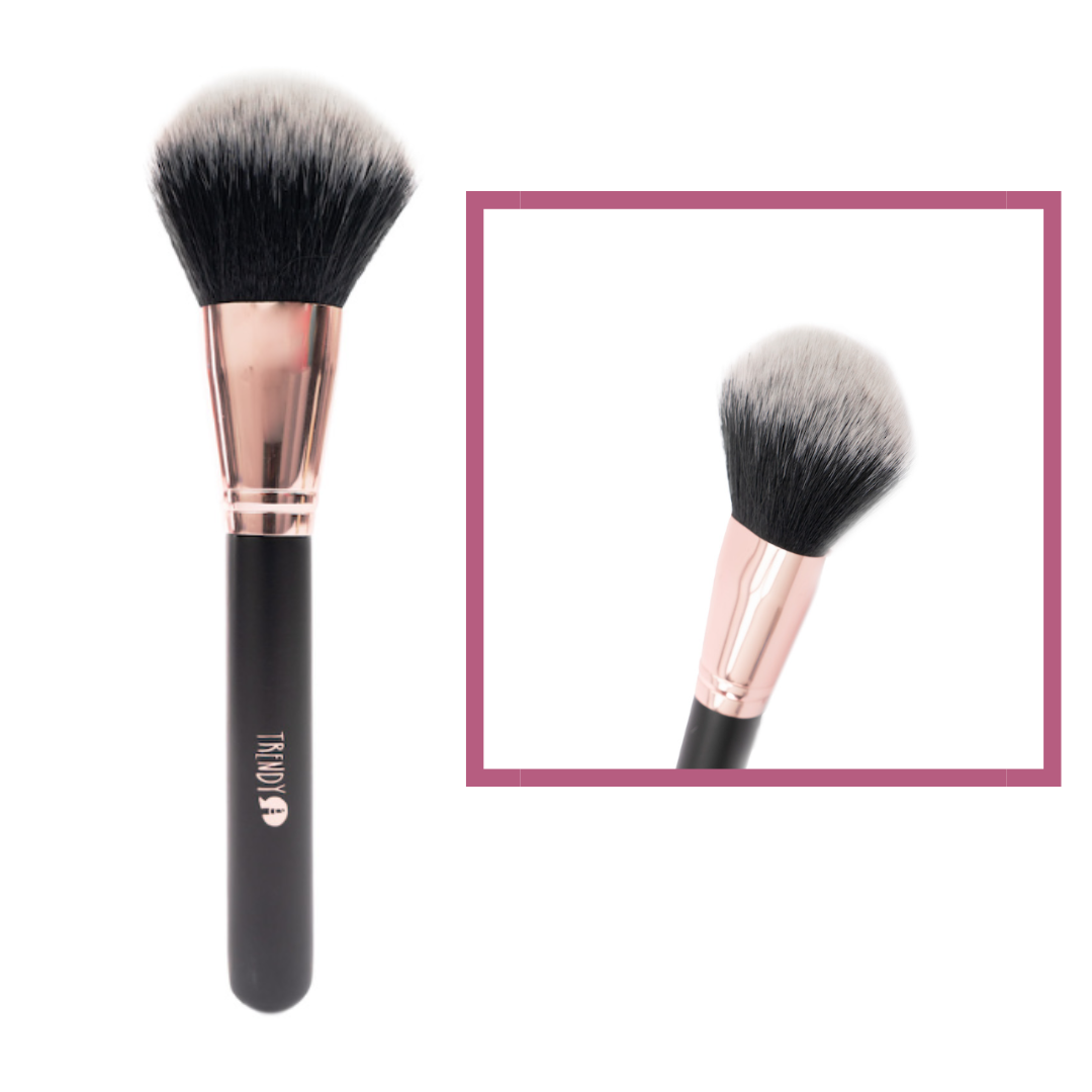 Brocha profesional de gran densidad y forma tupida, diseñada para la aplicación uniforme de polvos sueltos y compactos.