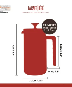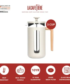 Este modelo de 3 tazas de La Cafetière es una pequeña prensa de café que combina lo vintage con lo moderno. El filtro de malla fina es duradero y está fabricado en acero inoxidable resistente al óxido. Su soporte también es de acero inoxidable. El vaso es de vidrio de borosilicato resistente al calor y a los choques térmicos. Tiene un asa de madera de abedul natural que es cómoda y permite verter la bebida con seguridad. También está disponible en tamaño de 8 tazas y en llamativos colores rojo, crema, negro, cobre y acero inoxidable cepillado.