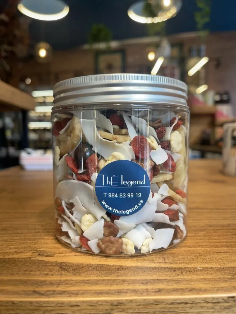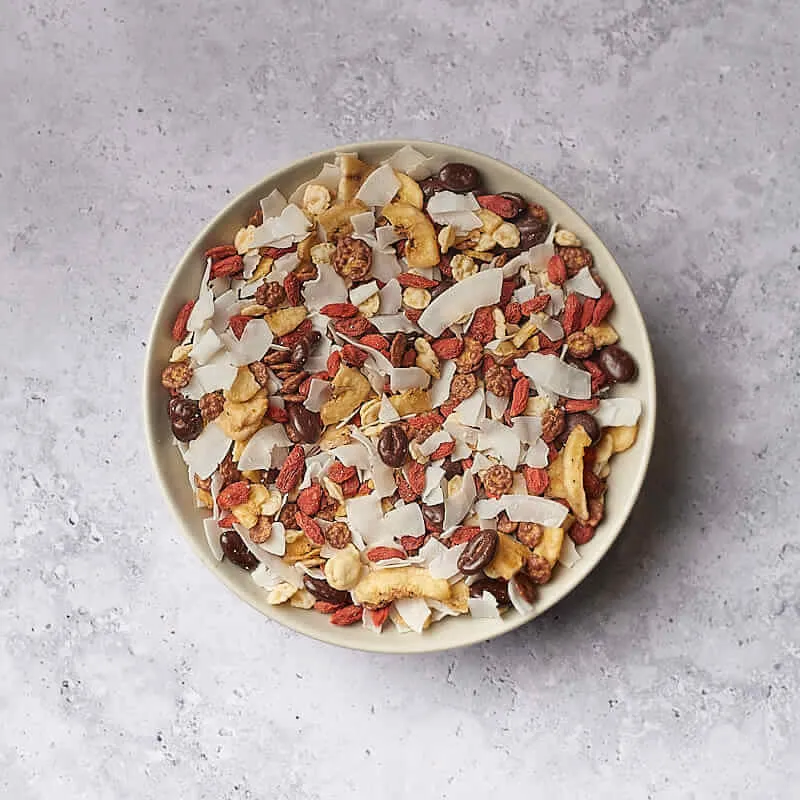 Una mezcla estupenda para comenzar el día con el pie derecho. Tómate un buen puñado de nuestra deliciosa mezcla a base de plátano, coco, bayas de Goji, pasas sultanas, pasas bañadas en chocolate negro y almendras crudas por la mañana y será nominado a mejor momento del día. Haz del desayuno, un momento único e inigualable con este mix de chocolate y frutas.