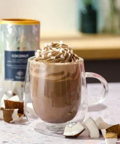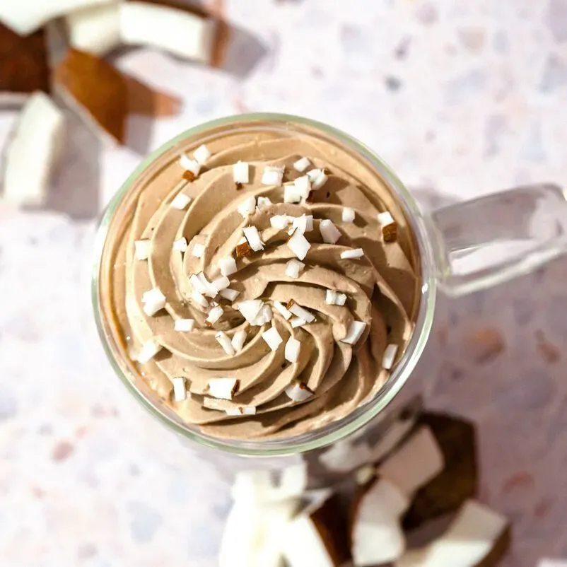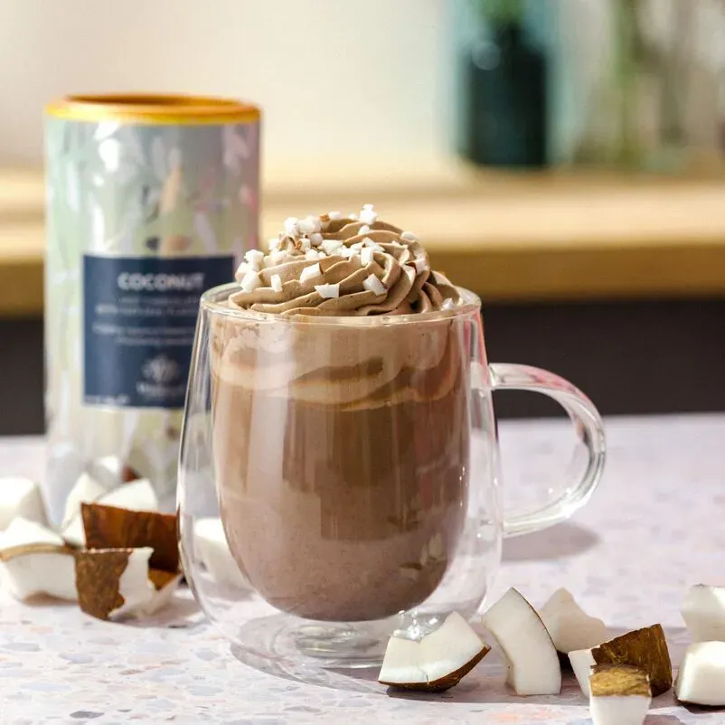 Hemos tomado un chocolate caliente que ya era sumamente cremoso y lo hemos vuelto aún más delicioso al agregarle coco. Perfecto para una taza de indulgencia rica y sorprendentemente liviana.