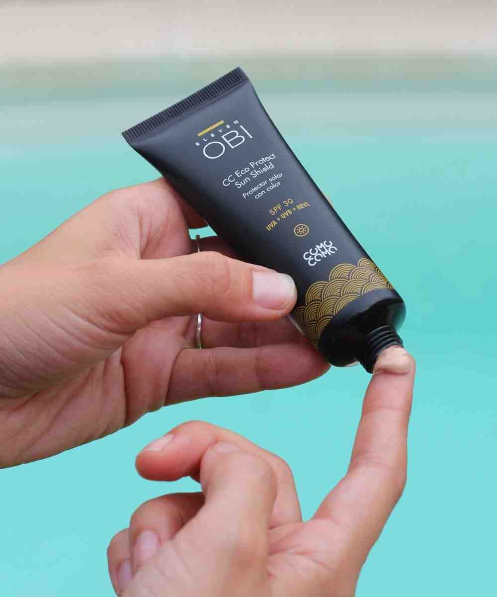 Crema de alta Protección Solar Física con color, pero tambien de tratamiento antimanchas y antioxidantes de Eleven OBI en colaboración con Nuria Coll de Como Como Foods. Ecológico, vegano, con factor de protección spf 30.