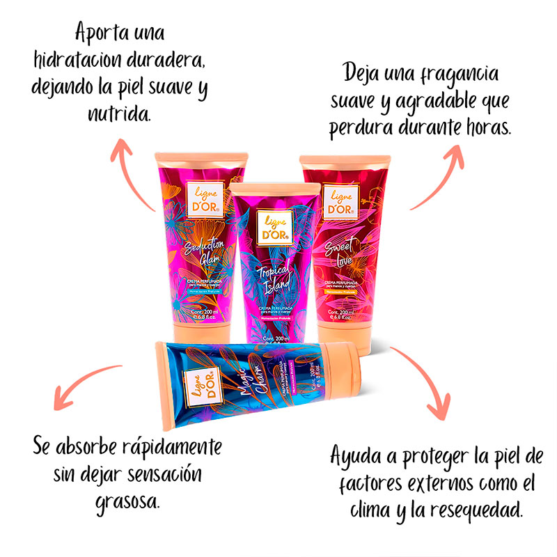 Crema Perfumada Manos y cuerpo Ligne D’or hidrata y suaviza la piel, dejándola perfumada y fresca durante todo el día. Su fórmula nutritiva está diseñada para manos y cuerpo, proporcionando un cuidado completo que mejora la elasticidad de la piel, dejándola suave y con un delicado aroma.