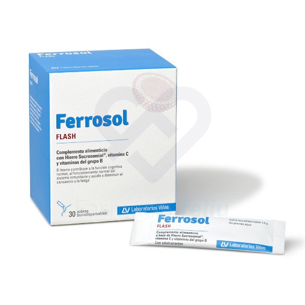 Ferrosol Flash es un aporte adecuado de Hierro Sucrosomial, Vitamina C, y Vitaminas B necesario por el aumento de las necesidades del organismo derivadas de menarquias y menstruaciones o ingestas insuficientes. Sobres bucodispersables de fácil disolución en boca, con un agradable sabor cola.