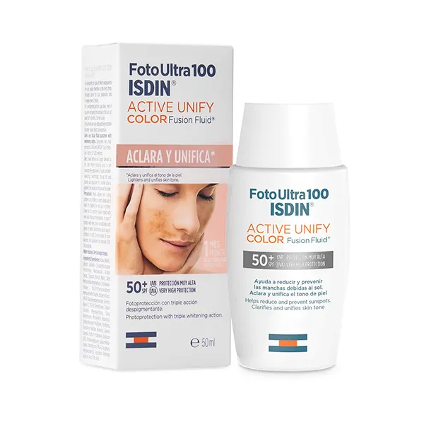 Protector solar facial con color y acción despigmentante que unifica el tono Ayuda a corregir las manchas ocasionadas por la radiación UVB/UVA con el fotoprotector de uso diario Active Unify Color SPF 50+. Su fórmula con color proporciona triple acción despigmentante y una muy alta protección, unificando el tono de la piel. 50 ml