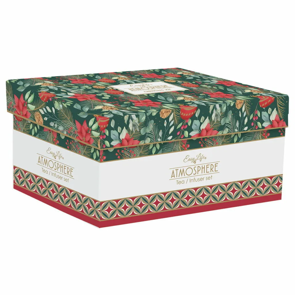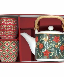 Juego de 3 piezas compuesto por dos tazas de porcelana y una tetera de porcelana con mango de bambú y un colador de metal para preparar el té con diseños navideños.
