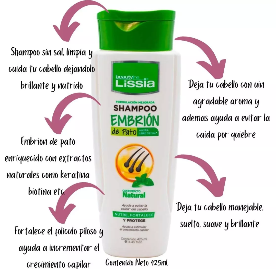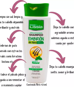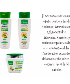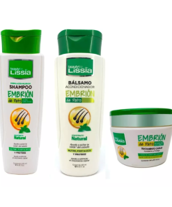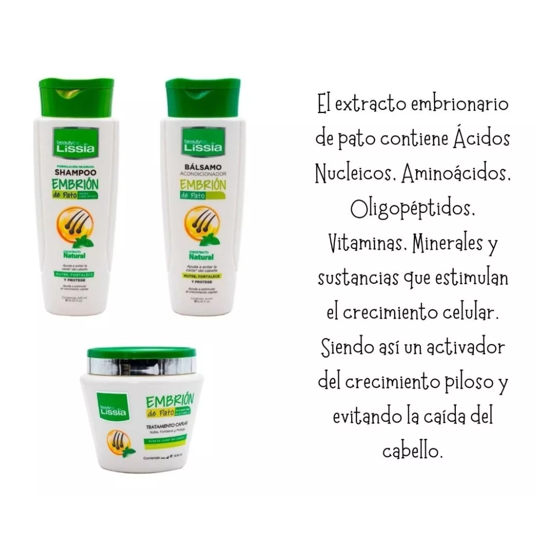 El «Kit Cuidado Capilar Reparación Intensiva Embrión de Pato» es un conjunto de productos para el cuidado del cabello que incluye champú, acondicionador y mascarilla capilar. Estos productos están formulados con extracto de embrión de pato, que se dice que es rico en nutrientes como proteínas y vitaminas, y puede ayudar a reparar y fortalecer el cabello dañado.