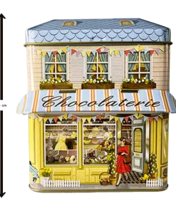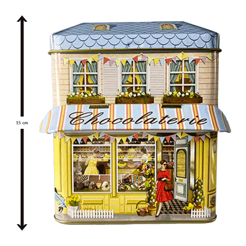 Lata bombones praliné leche ‘Casita bombones Chocolaterie’ 150g. A la lata no le falta detalle, por una fachada el furgón de reparto y por la otra el precioso escaparate con visera a modo de toldo.