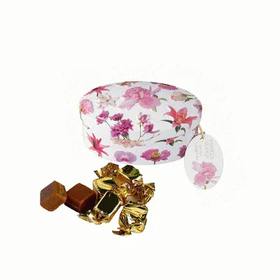 Deliciosos caramelos escoceses tipo fudge de vainilla, en una preciosa lata decorada con flores orquídeas.