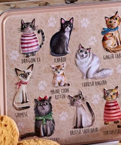 Preciosa lata decorada con adorables gatos en relieve adorable representa gatos en relieve, perfecta para los amantes de los gatos. La lata contiene las deliciosas y populares galletas inglesas Gradma Wild´s de jengibre con limón, limón y galletas de chocolate. Hechas al horno, según el método tradicional y con los mejores ingredientes.