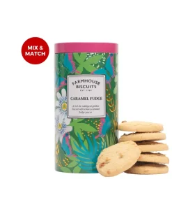 Una rica y deliciosa galleta dorada con trocitos de dulce de caramelo masticables. Vienen envueltas en una lata tropical con relieve, colorida y con un diseño brillante. El regalo perfecto para alguien especial o, por supuesto, solo para ti.