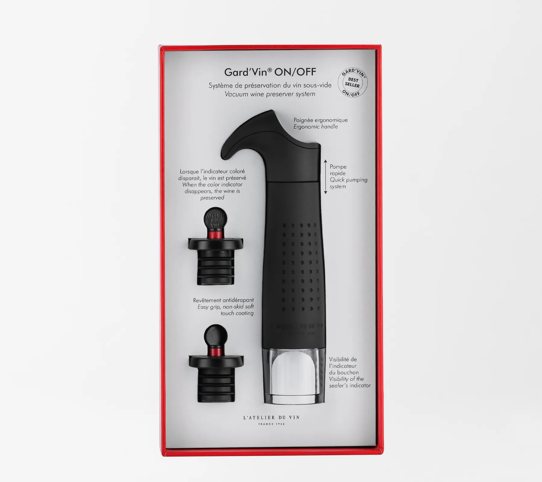 Cuando se trata de disfrutar de un buen vino, es esencial mantener sus aromas y sutilezas intactos, incluso después de abrir la botella. La bomba de vacío Gard’Vin On/Off te permite hacerlo al eliminar eficazmente el oxígeno de la botella abierta. Al hacerlo, prolonga la vida útil del vino y te permite apreciar todas las características de su perfume y sus aromas como si estuvieras abriendo la botella por primera vez.