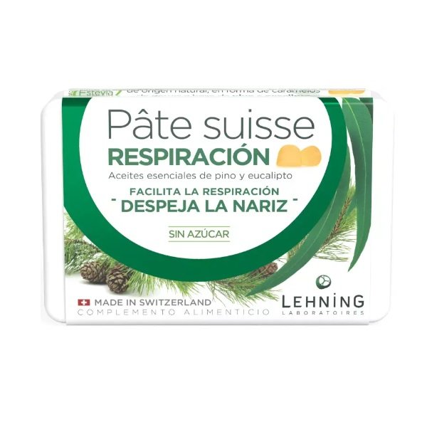 Lehning Pâte Suisse Respiración, es un complemento alimenticio en gominolas para despejar y mejorar las vías respiratorias con su formulación en aceites esenciales de pino y eucalipto.