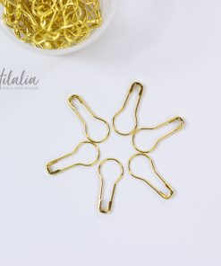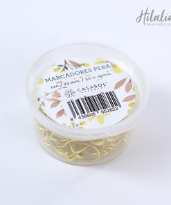Cajita de marcadores metálicos para punto o ganchillo de imperdible en color oro. Cajita de plástico con aprox. 50 unidades.