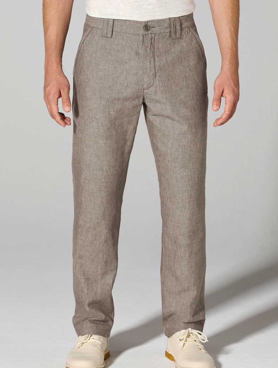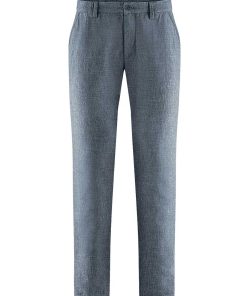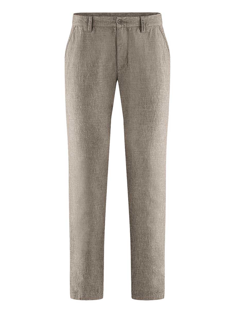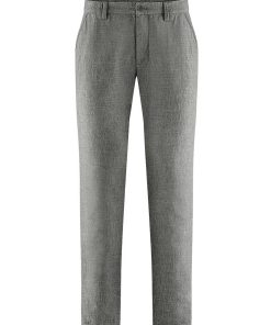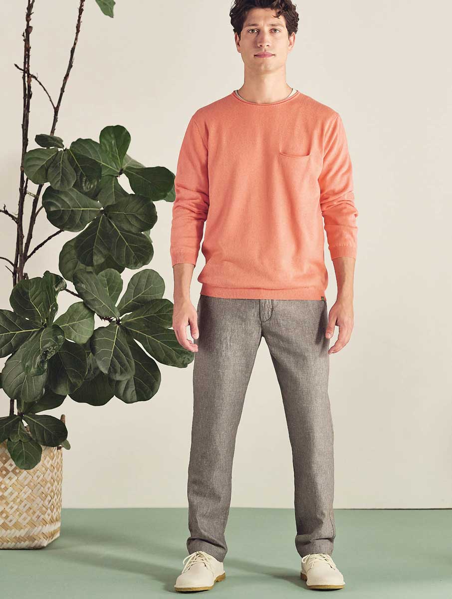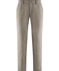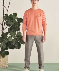 Estos chinos para hombre de materiales orgánicos tienen un moderno aspecto jaspeado. De corte recto, cuentan con doble trabilla, botón de corozo natural, bolsillos laterales y bolsillos ribeteados en la parte trasera.