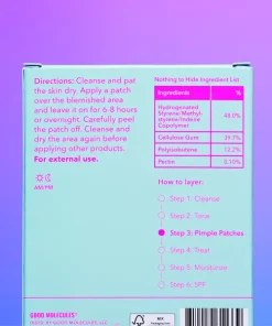 Limpiar y secar la piel con palmaditas. Parches para granos 60 uni Good Molecules aplique un parche sobre el área con imperfecciones y déjelo actuar durante 6 a 8 horas o toda la noche. Retire con cuidado el parche. Limpiar y secar nuevamente la zona antes de aplicar otros productos.