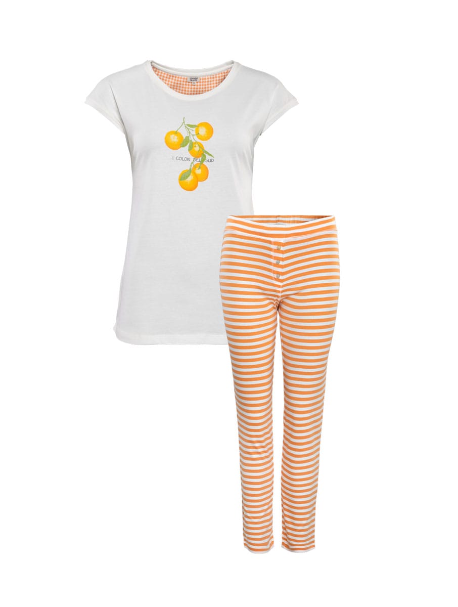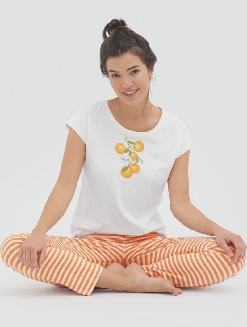 Colores: Camiseta blanca con motivo de naranjas y pantalón a rayas naranja/blanco.