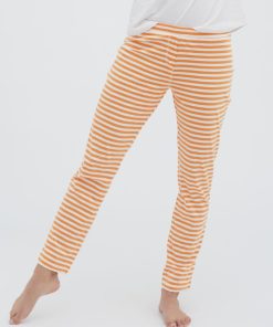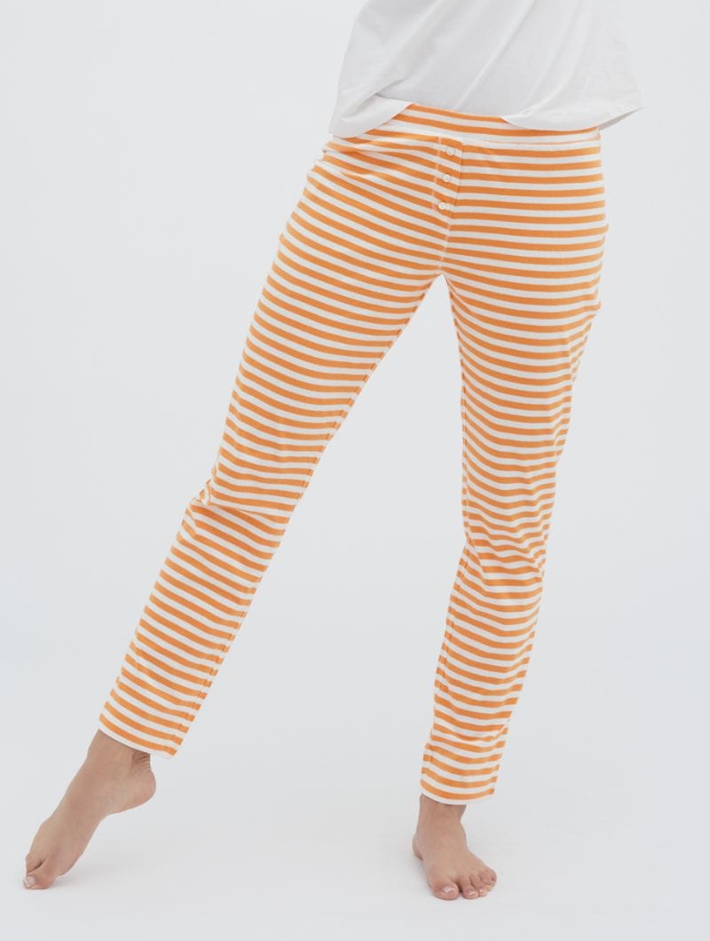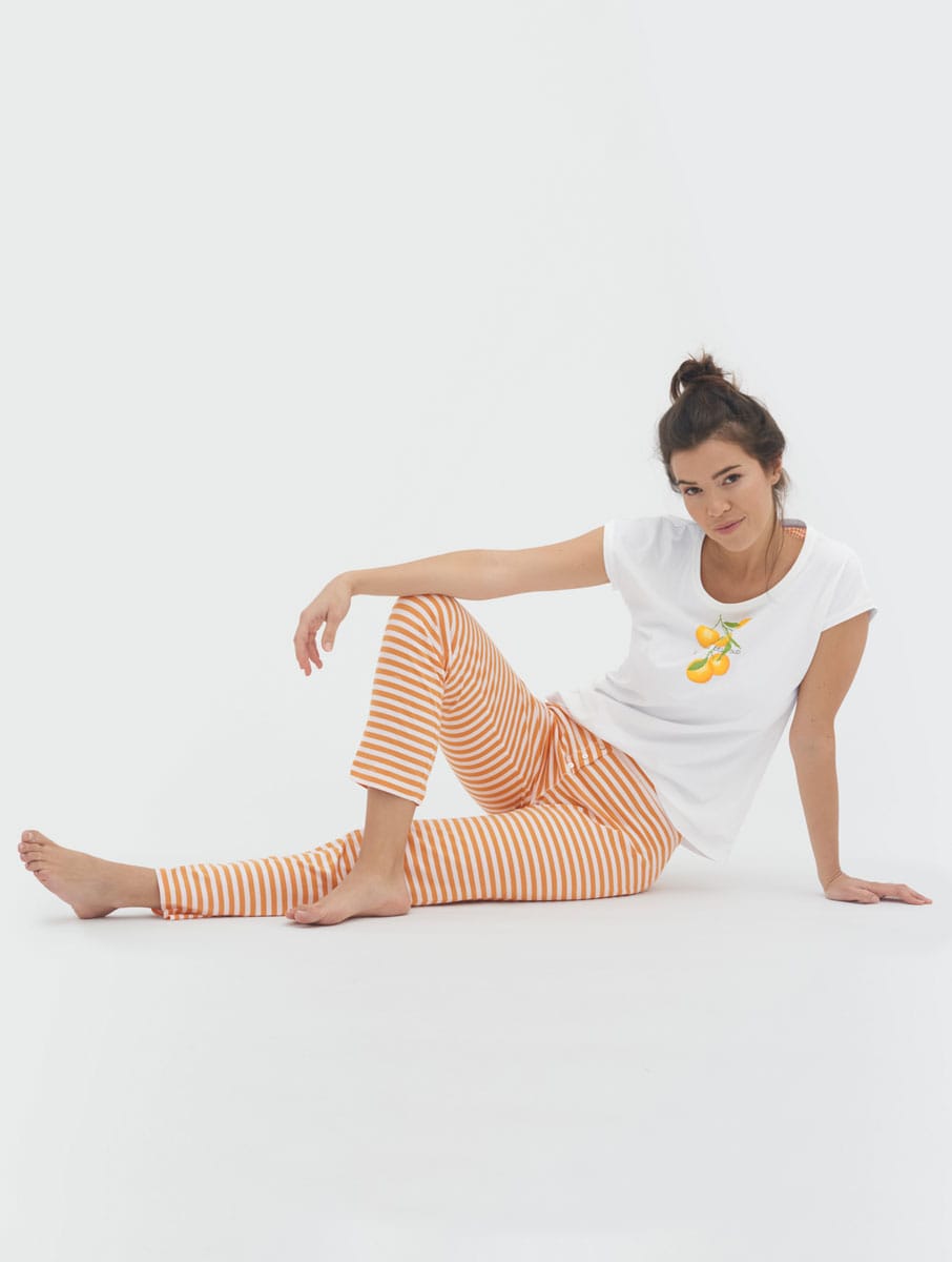 Es un conjunto formado por una camiseta blanca y unos pantalones largos a rayas de color naranja. Ambas prendas están hechas de algodón orgánico 100%, un tejido natural que mima tu piel y el planeta.