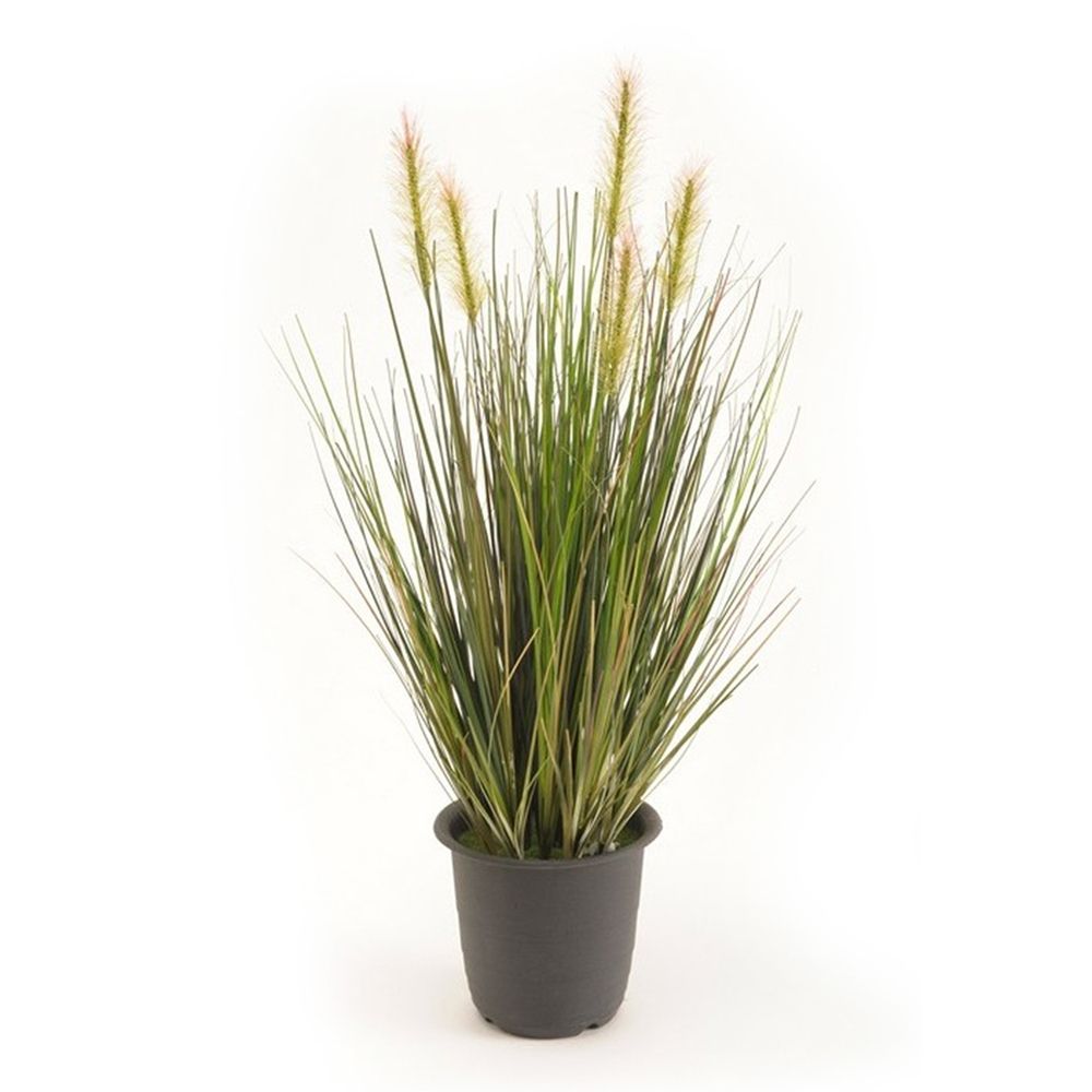 Hermosa planta de hierba verde de 45 cm de altura, ideal para exteriores ya que no se decolora, convirtiéndose en el complemento perfecto en tu jardín. Incluye macetero básico de 10 centímetros.