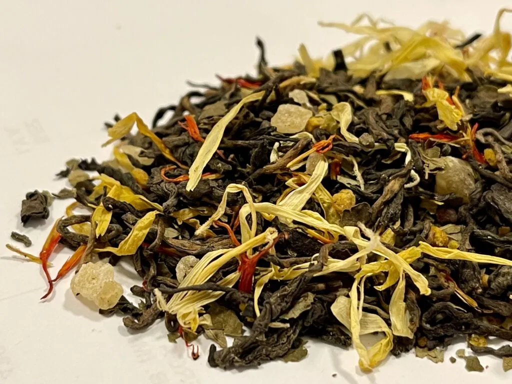 Ingredientes:Té rojo Pu Erh, piña confitada, trocitos de melón, hojas de mora, polen de flores de miel, caléndula, cártamo y aromas.