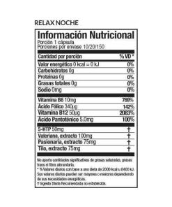 INGREDIENTES PRINCIPALES POR CÁPSULA: 5-HTP 50 mg, valeriana 100 mg, pasionaria 75 mg, tilo 75 mg, vitamina B6 10 mg, ácido fólico 340 µg, vitamina B12 50 µg, ácido pantoténico 5 mg.
