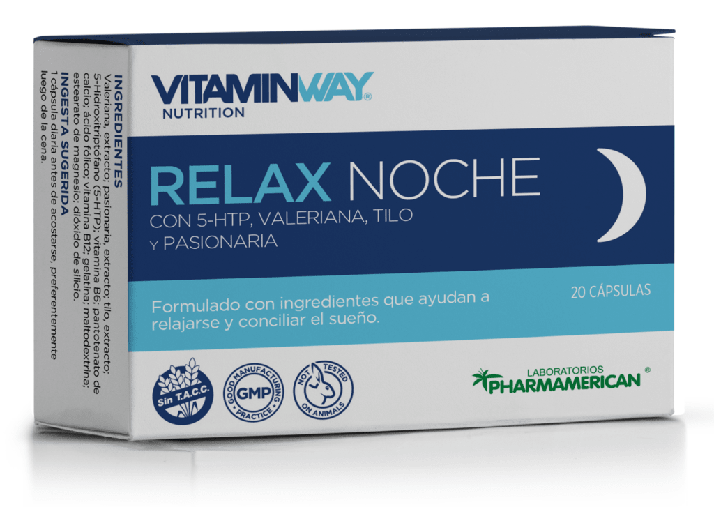 El suplemento nutricional Relax Noche Vitamin Way® ayuda a relajarse y conciliar el sueño. Formulado con ingredientes de origen vegetal que ayudan a mejorar la calidad y cantidad de horas de sueño. No produce dependencia, embotamiento matinal ni altera los reflejos.