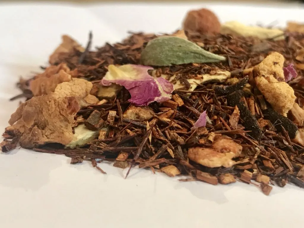 INGREDIENTES: Rooibos, naranja, canela, manzana, clavo, pétalos de rosa y cardamomo (todos ellos de cultivo ecológico)