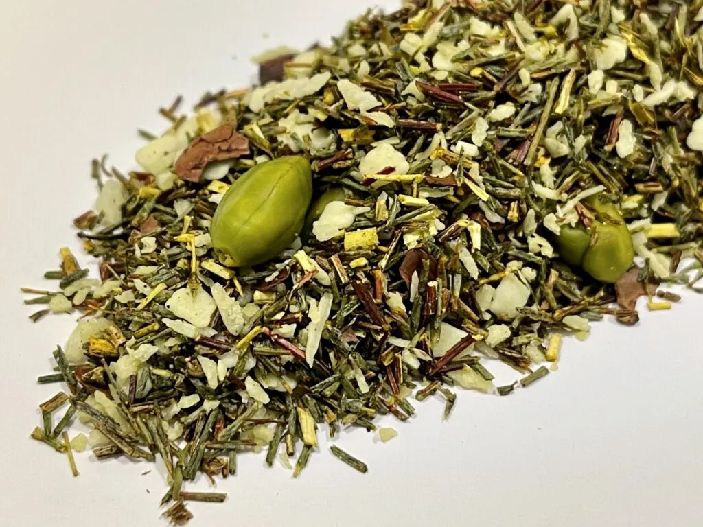 INGREDIENTES: Rooibos verde, chocolate blanco, copos de coco, pistachos, cáscaras de cacao y aroma natural.