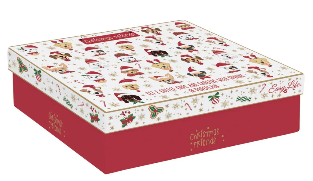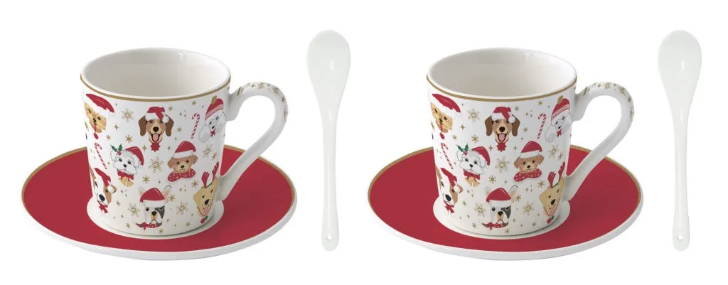 Set de 2 tazas con plato y cucharillas para espresso con 100 ml. de capacidad. Nuestros amigos los perros lucen festivos con sus gorros de Navidad.