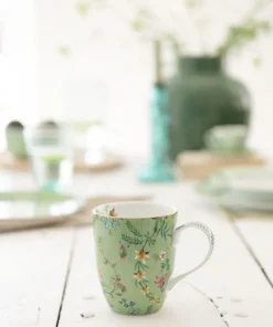 Un conjunto de dos tazas grandes de nuestra colección tropical Jolie. Estas hermosas tazas tienen un fondo verde con flores coloridas. Imagínese en una isla tropical y eche un vistazo a las plantas tropicales, decoradas en estas tazas. Perfecto para alegrar tu vajilla. Las asas de las tazas están decoradas con elegantes detalles azules. Combina estas tazas con otros artículos de porcelana de nuestra colección Jolie para un look hermoso.