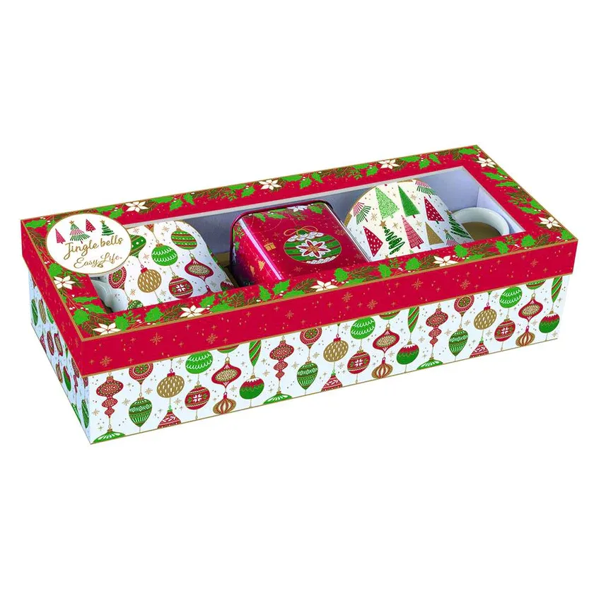 Maravilloso set de regalo con dos tazas de porcelana y una caja de metal para guardar el té con una maravillosos diseños navideños de la colección JINGLE BELLS de Easy Life, una línea de accesorios para la cocina y la mesa dedicada a los amantes de la Navidad.Perfecto para disfrutar durante los momentos de relax de las fiestas navideñas..