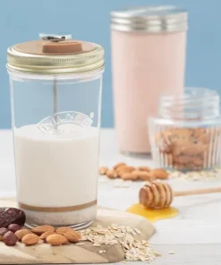 Este set incluye dos frascos de vidrio Kilner® que le permiten crear un segundo lote, mientras almacena o consume su creación original. Todo lo que necesita es una licuadora de mano eléctrica para mezclar las nueces y el líquido para formar una consistencia suave. El innovador protector contra salpicaduras de silicona evita derrames de líquidos y salpicaduras durante el proceso de mezcla.