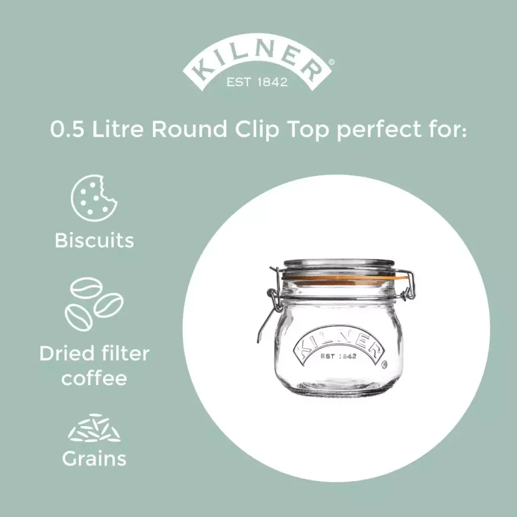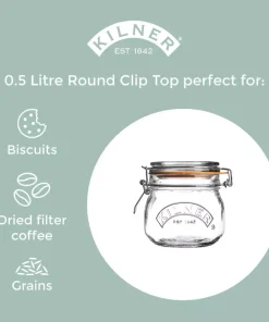 La capacidad del frasco es de 0,5 litros / 500 ml, que es el tamaño perfecto para conservar mermelada, chutneys y almacenar alimentos secos como té, café y granos. Cada frasco encarna el estilo tradicional de Kilner® con el auténtico logotipo en relieve y contiene un folleto de instrucciones detallado en su interior.