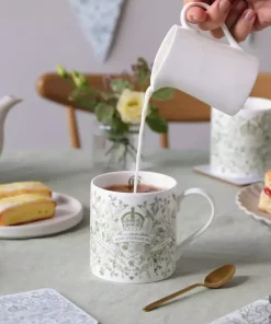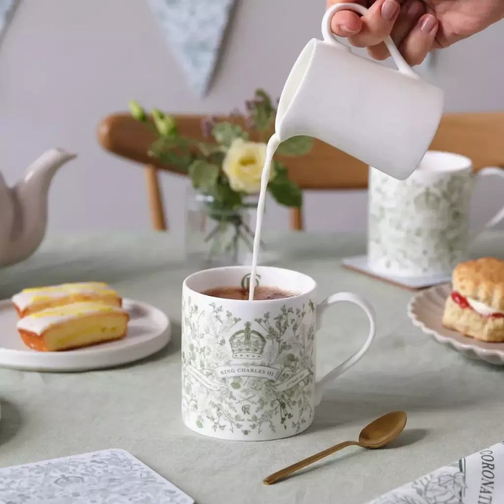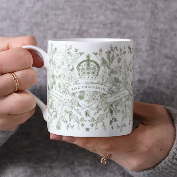 La taza de la coronación del rey Carlos III lleva las flores nacionales del Reino Unido junto con el roble, un símbolo de fuerza y estabilidad, y la hiedra, el símbolo del compromiso, que se arrastra a lo largo de este intrincado diseño dibujado a mano.