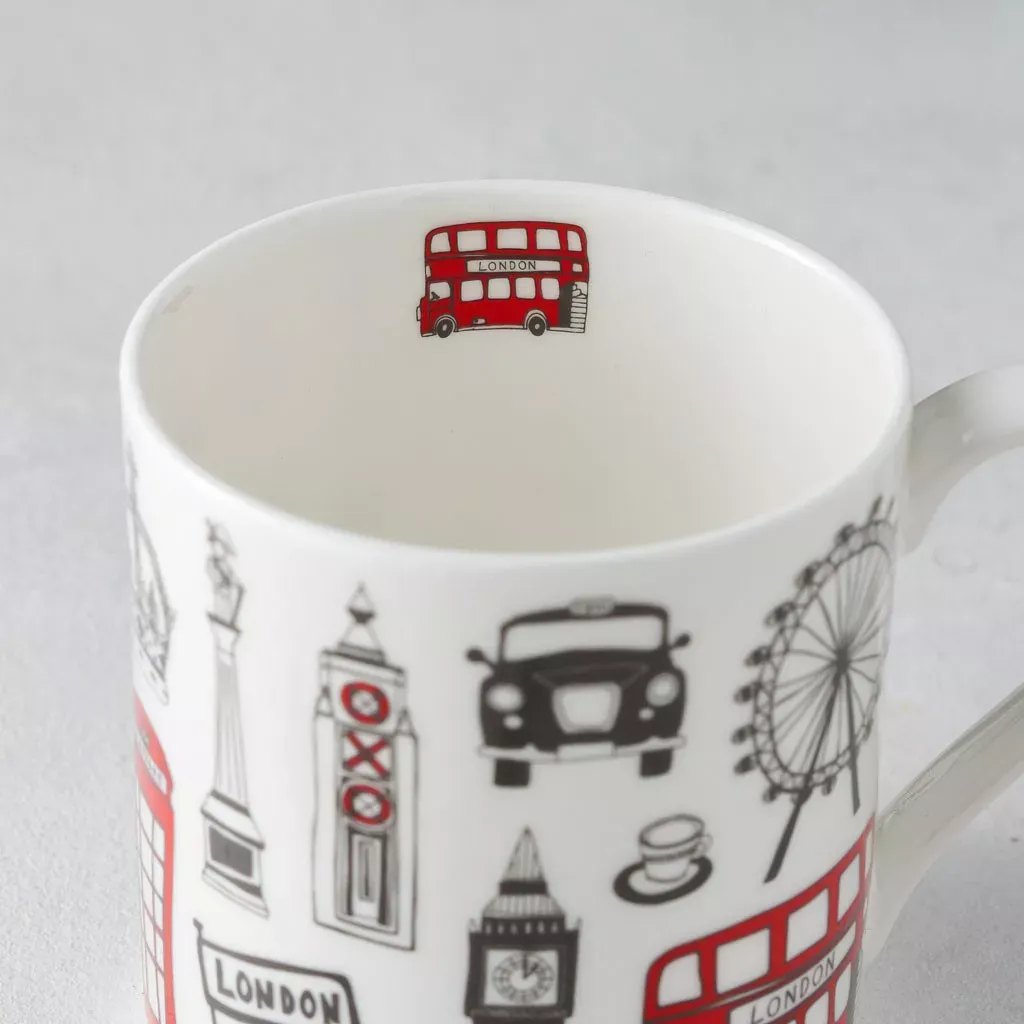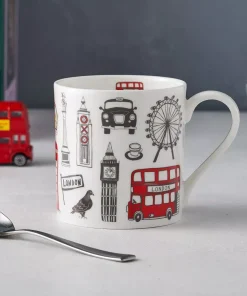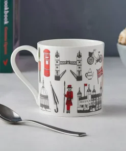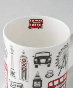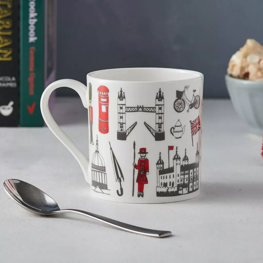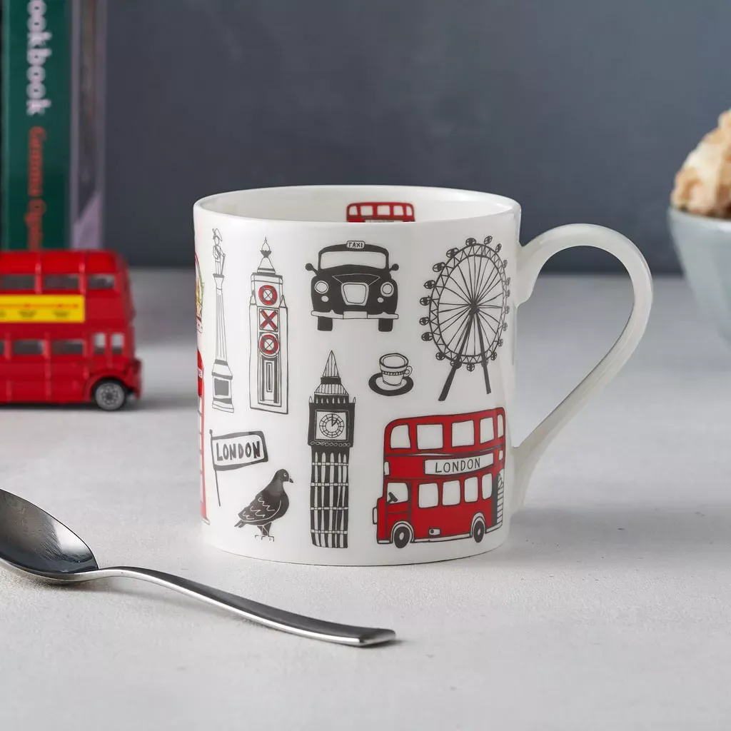 Agregue un poco de diversión urbana a su taza de té de la mañana con esta taza de Londres bellamente ilustrada.