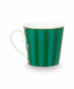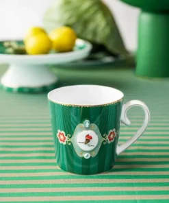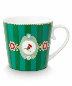 Esta taza grande de porcelana verde a rayas forma parte de la colección Love Birds favorita de todos los tiempos de Pip. Decorado con una cenefa con bordes dorados. La llamativa pieza central es un petirrojo de colores brillantes. Combina maravillosamente con el resto de artículos de porcelana de esta colección.