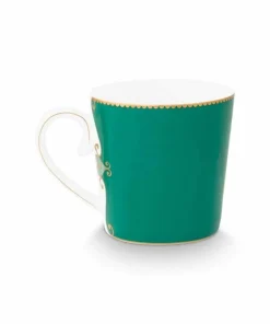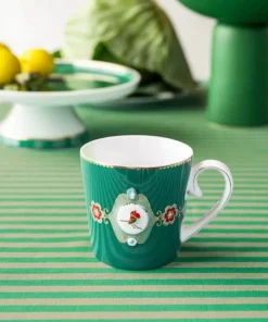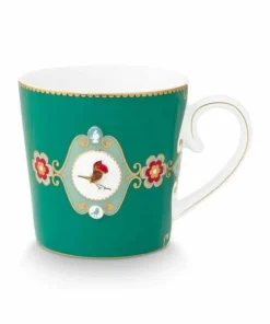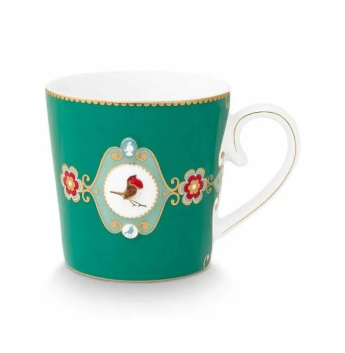 sta taza grande de porcelana verde forma parte de la colección Love Birds favorita de todos los tiempos de Pip. Decorado con una cenefa con bordes dorados. La llamativa pieza central es un petirrojo de colores brillantes. Combina maravillosamente con el resto de artículos de porcelana de esta colección.