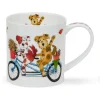 Como muestra de un día perfecto, dos gatos se sientan alegremente sobre su bicicleta roja brillante, con canastas de peces y flores, mientras que en la parte posterior de la taza, una pequeña pandilla de gatos prepara sus maletas y emprende un viaje en un automóvil azul brillante.