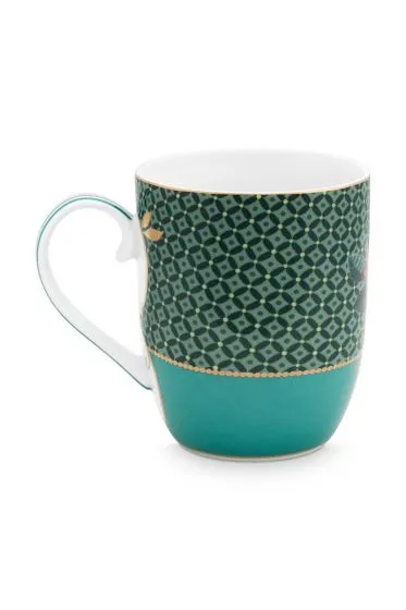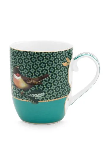 Una pequeña taza verde de nuestra gama Winter Wonderland de ropa de mesa de porcelana. Rodeado de una variedad de bayas, bellotas y flores de temporada, encontrarás un pájaro. Cada taza está decorada con elementos de lujo, como el acabado dorado en el mango.