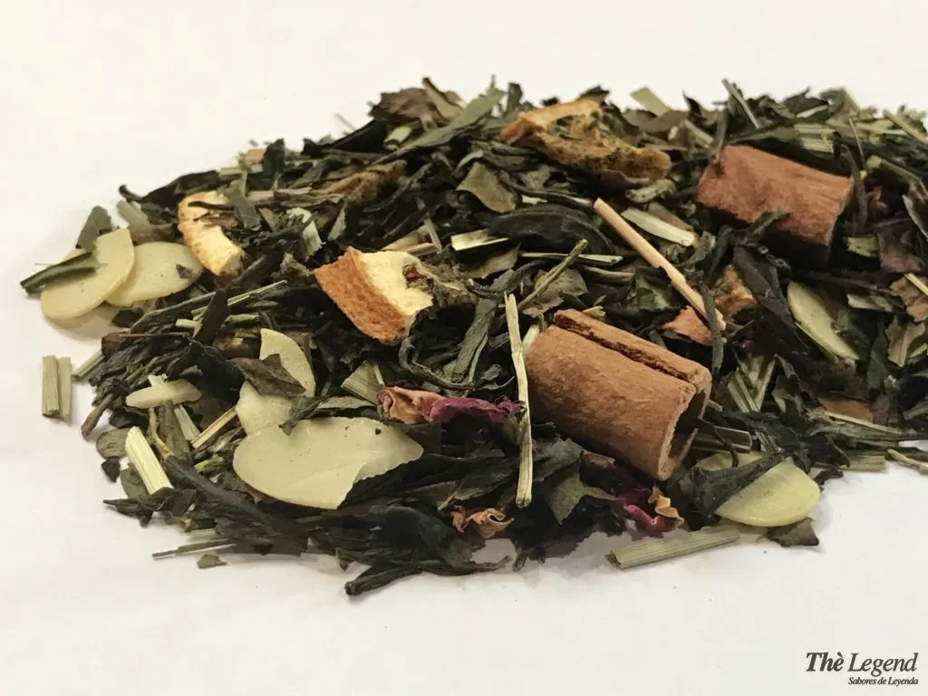 INGREDIENTES: Té blanco Pai Mu Tan, té verde Sencha, canela, lemongrass, almendra, rodajas de naranja y pétalos.