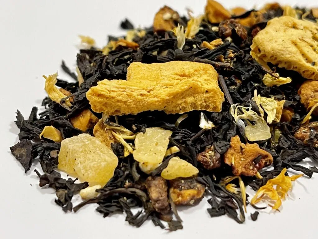 INGREDIENTES: Té negro, piña confitada, trozos de manzana, almendra, cáscaras de limón, gránulos de limón y yogur, flor pie de gato y aromas.
