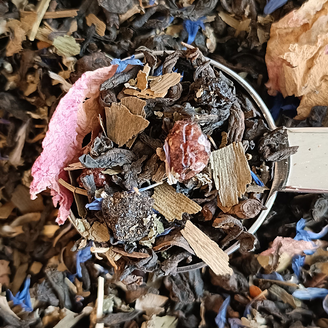 Ingredientes té rojo wellness guaraná: Té Pu Erh, ginkgo, guaraná, grosellas negras, grosellas, aroma, hojas de frambuesa, peonía, pétalos de aciano, hojas de zarzamora. Puede contener trazas de frutos secos.