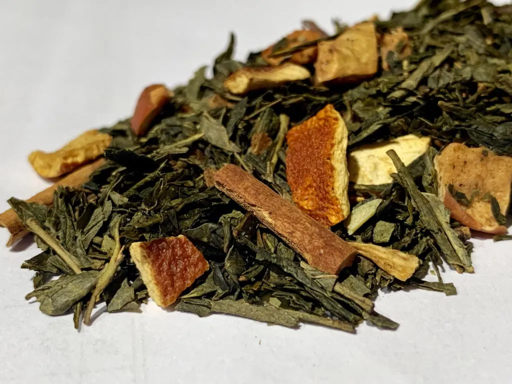 INGREDIENTES: Té verde Sencha, trozos de manzana, cáscara de naranja, trocitos de canela y vainilla.