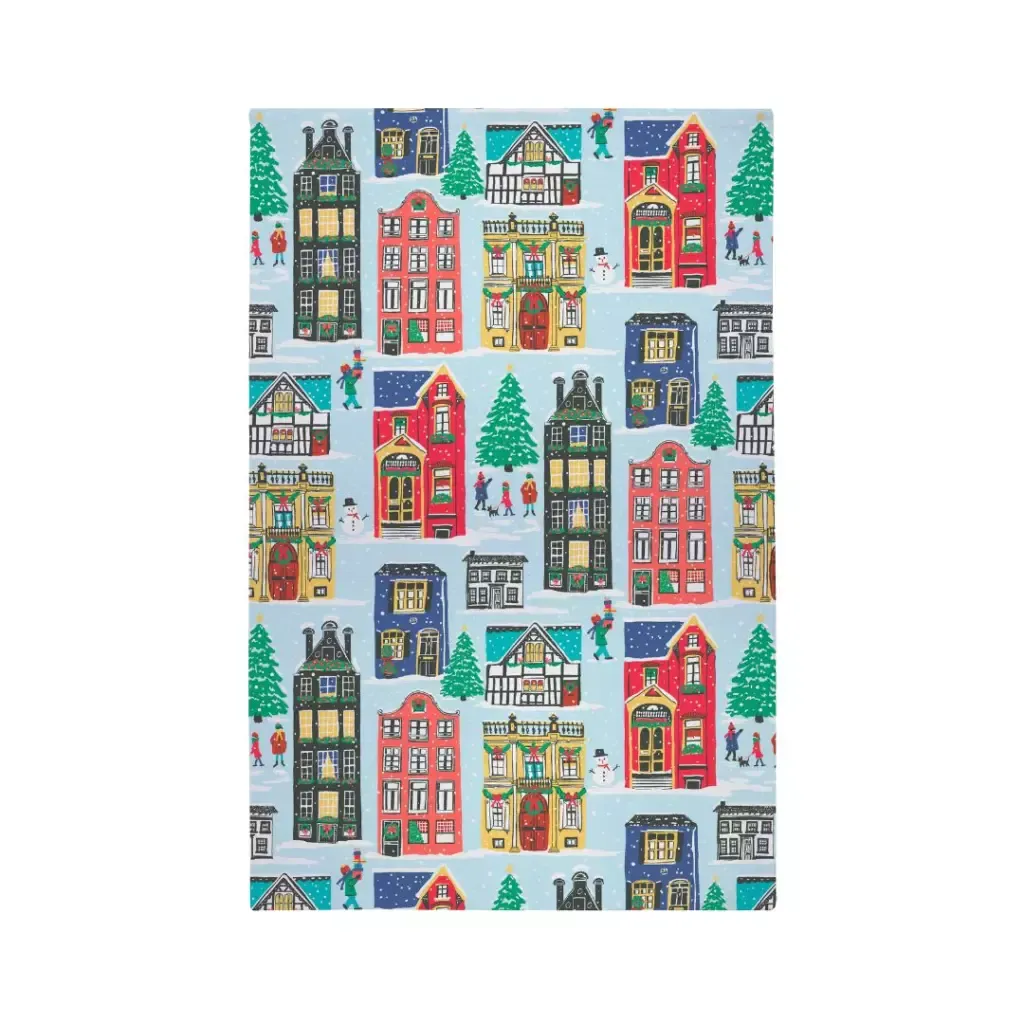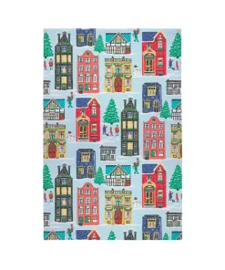 Este ecléctico paño de cocina presenta una selección de casas navideñas extravagantes pero tradicionales. Mire más de cerca y descubra las historias que cuenta este diseño bellamente ilustrado.
