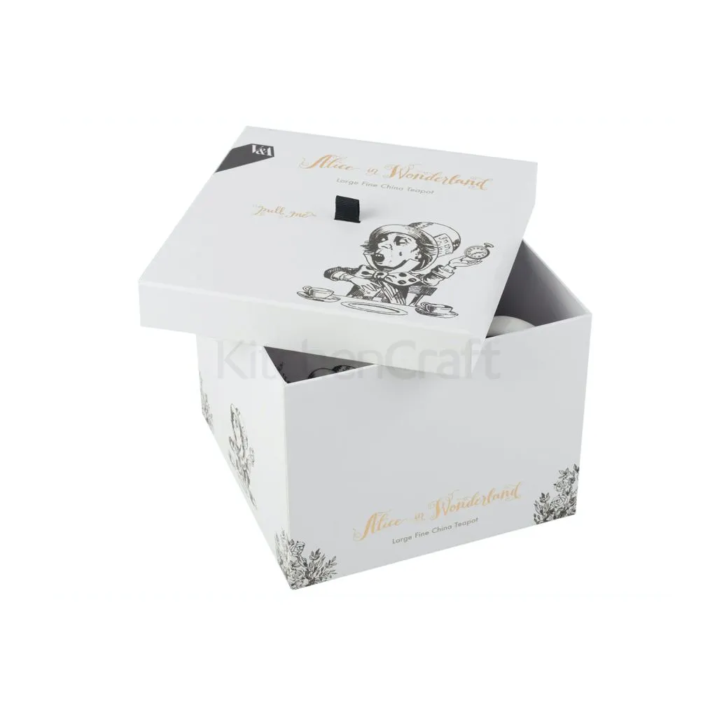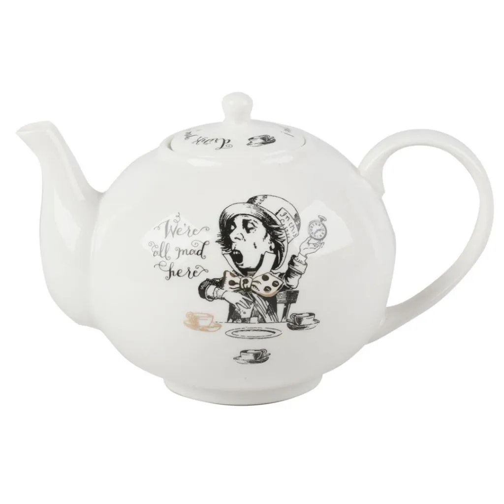 Mostrando al Sombrerero Loco en su fiesta de té con la cita «Todos estamos locos aquí», esta escena está dibujada a mano en blanco y negro con un toque de calcomanía de oro de lujo. Con el icónico «Drink Me!» alrededor de la tapa.