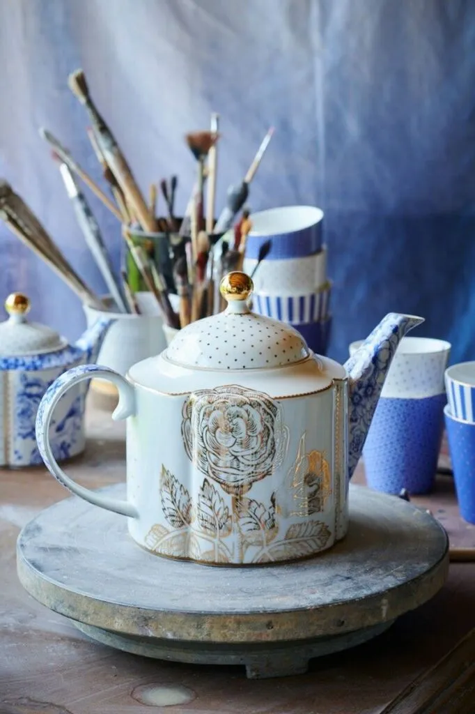 - Royal White es un diseño refinado con sutiles elementos azules y detalles dorados.