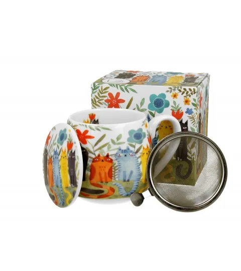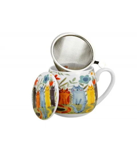 Taza de430 ml con infusor y tapa GARDEN FELINES, de la serie Animals, fabricada en porcelana New Bone China, caracterizada por un elegante y natural color blanco crema con un brillo delicado, además de una durabilidad excepcional.
