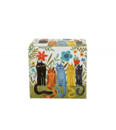 La línea está decorada con un motivo de gatos domésticos peludos y multicolores sentados en un prado florido. Todo tiene un estilo divertido y colores vivos y expresivos.