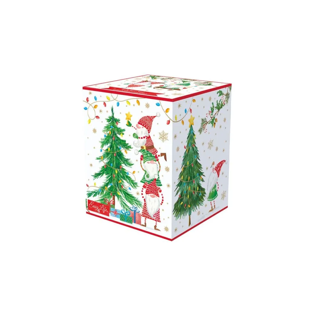 Conjunto de taza para hacer infusiones con filtro de malla metálico y tapa de porcelana a juego con la taza decorada con simpáticos gnomos navideños.